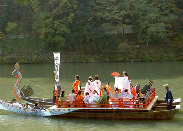 Arashiyama is a nice area to see beautiful scenery of colored maple leaves. Around the Togetsu-kyo bridge, you can see many imperial style boats and enjoy several events. It will be canceled if it rains.