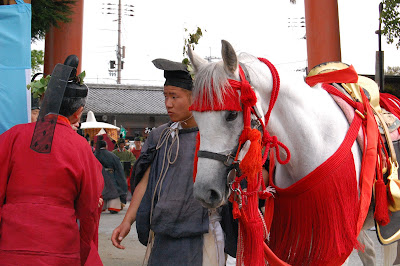 Saio-dai who is a princess of Aoi Matsuri gets off the car and walks from the entrance of the approach to Kamigamo Shrine. Some Imperial costumed girls attend her and proceed to the the main hall of the shrine slowly. How are the successive princess chosen? Every Kyoto girl hopes to be the princess? I don’t know, but the princess face looked quite tensed up. This is a cool expression, Japanese style.
