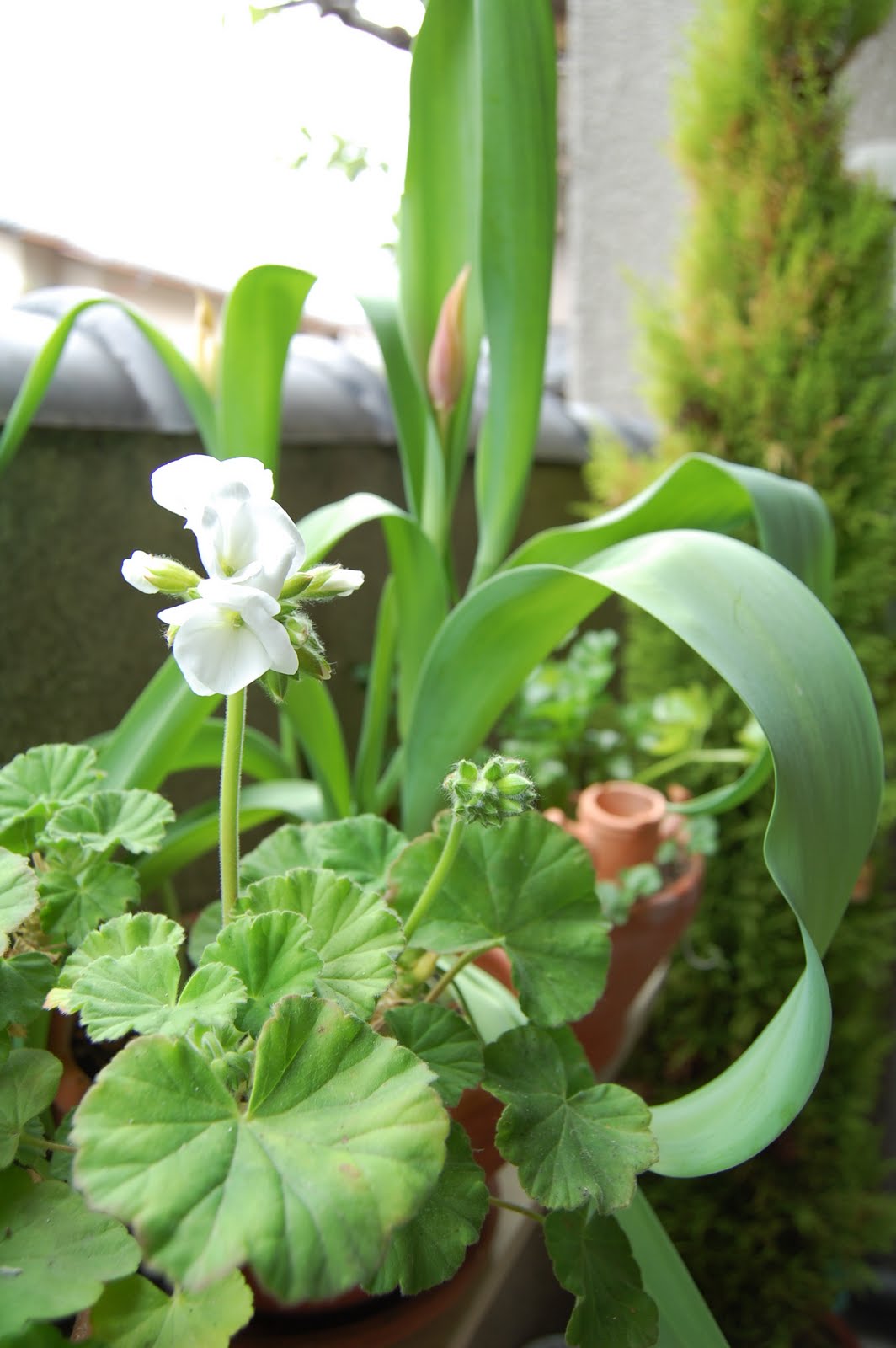 三寒四温すぎる異常な今年の春ですが、私の小さな小さなベランダガーデンは、負けずに春の装いになって来ています。秋に植えたチューリップが満開です。日光不足?か、すべては咲きませんでした。ちょっと秘密の記念に買った、白のゼラニウムは、茎もたくましくなり、次々に蕾が出来ています。このゼラニウムがぐんぐん育つ様子を見ると、かなり個人的理由で嬉しくなります。ユーカリも独特の香りが強くなって来ました。銀葉がとてもきれいです。